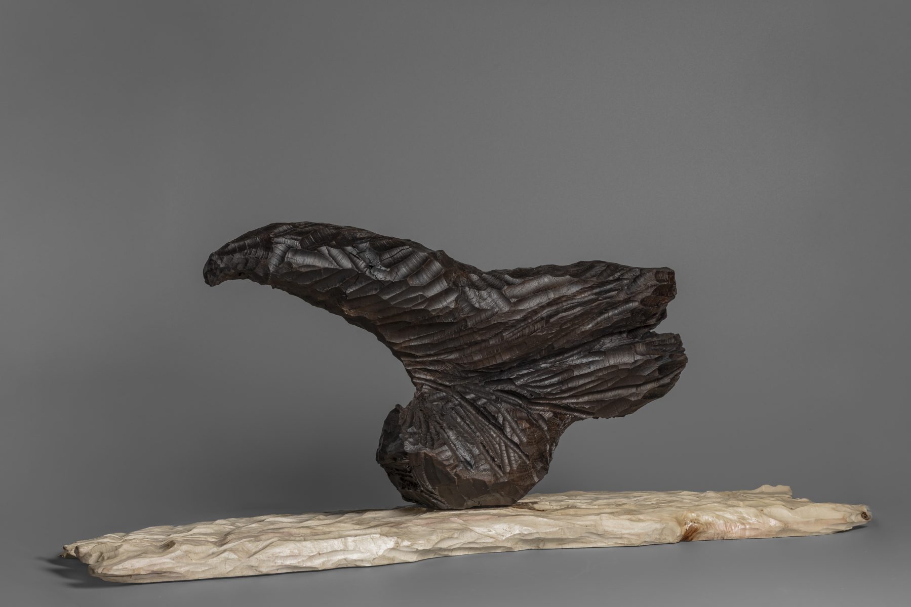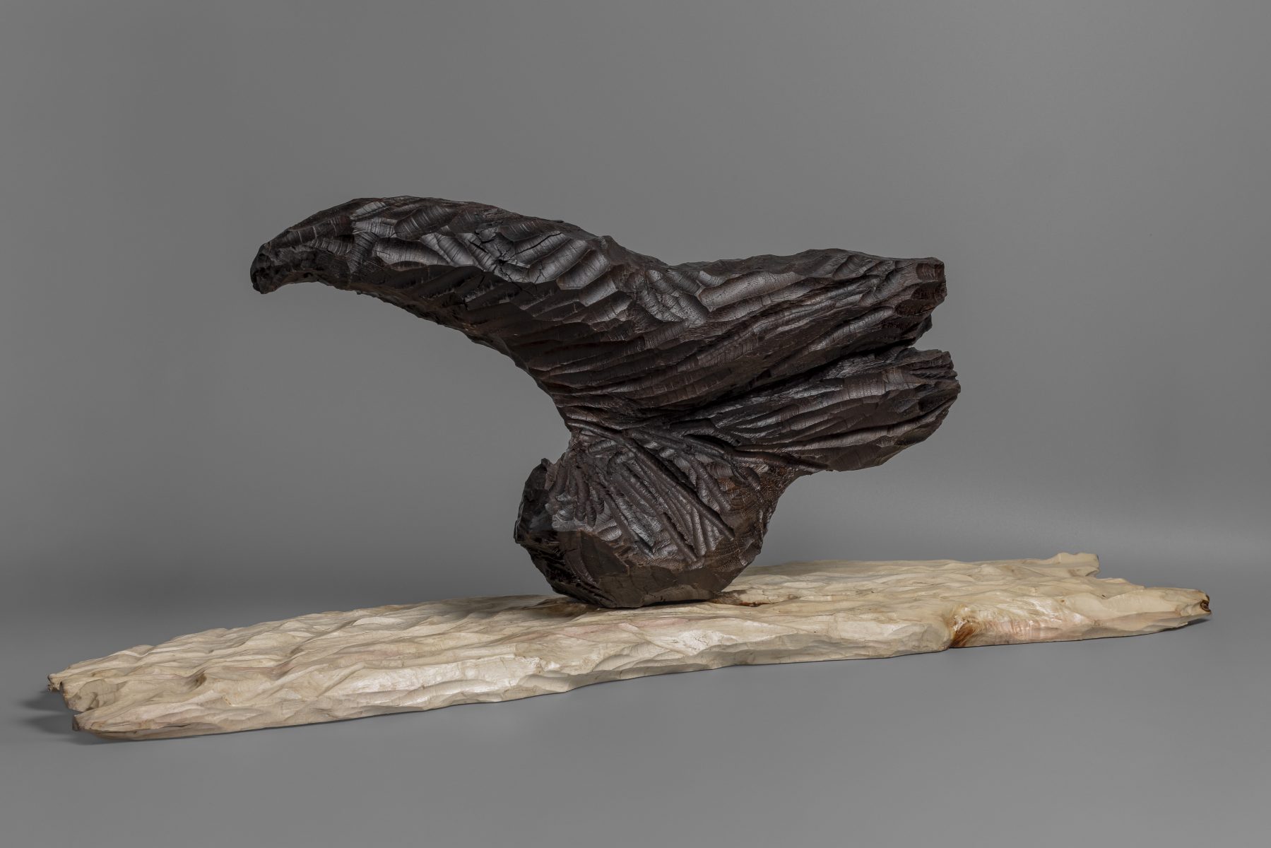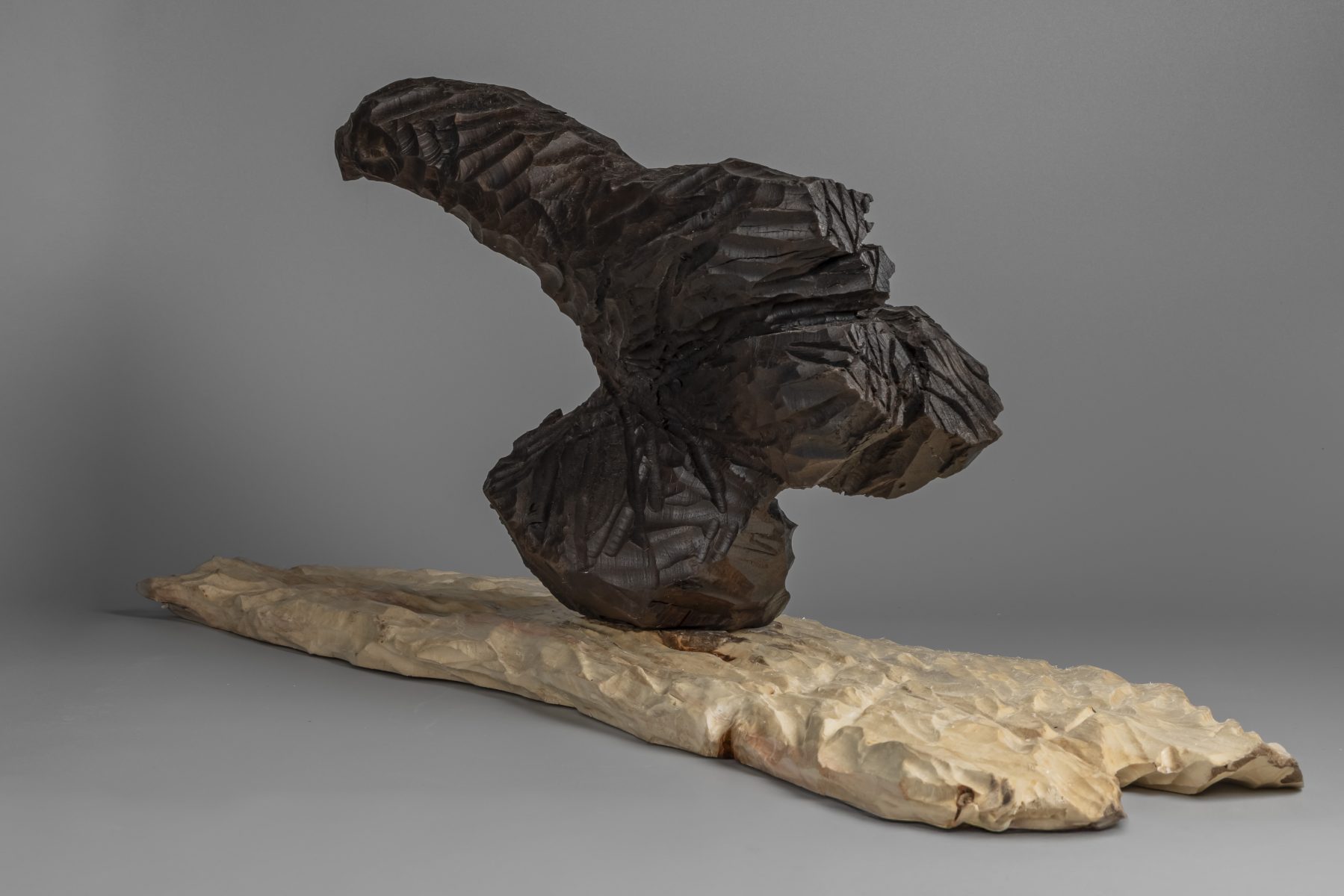 Escultura en madera de Nogal y Abedul. Representa ese vuelo ágil del cuervo que nos sobrevuela señalándonos el camino de la libertad, del cambio por venir.