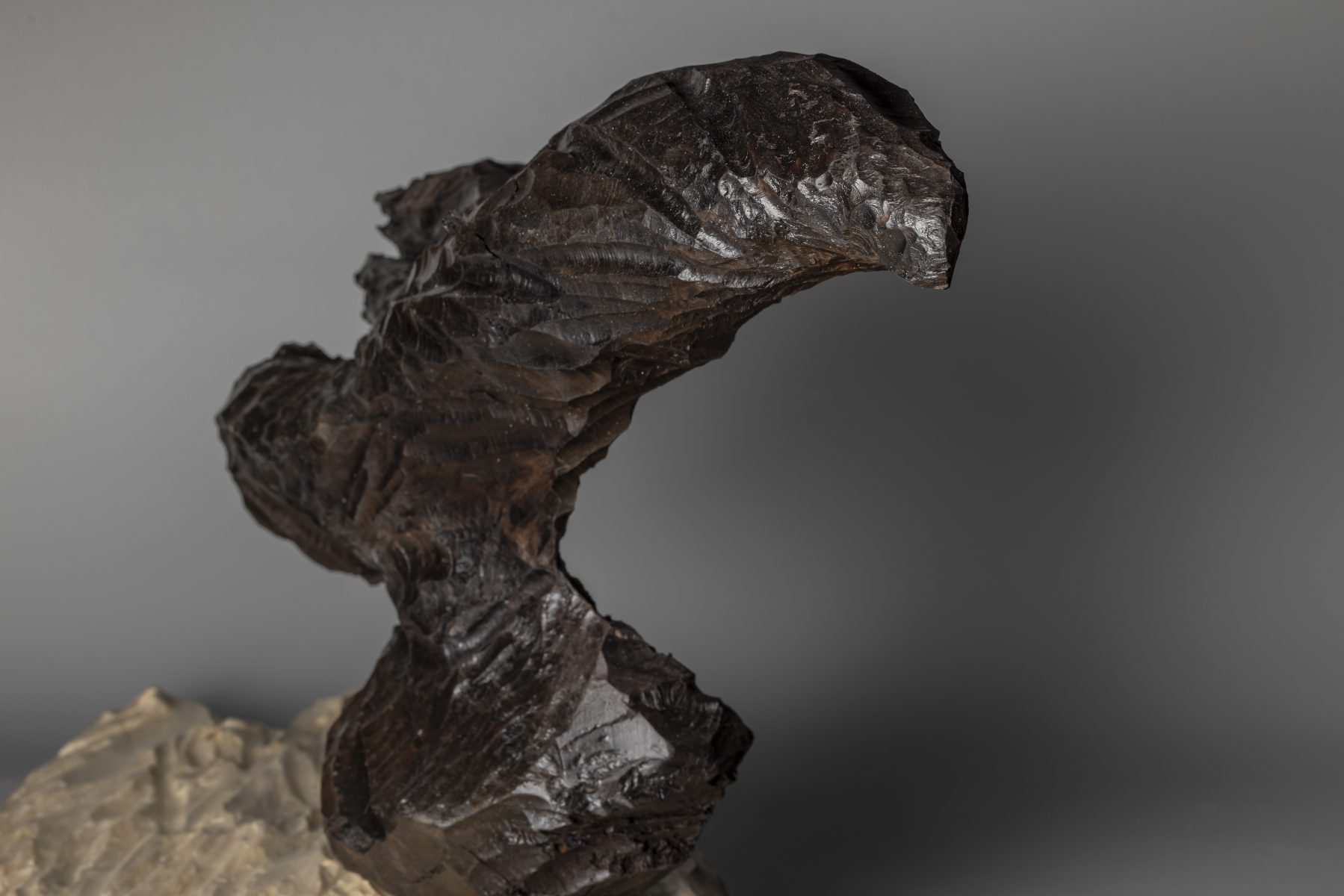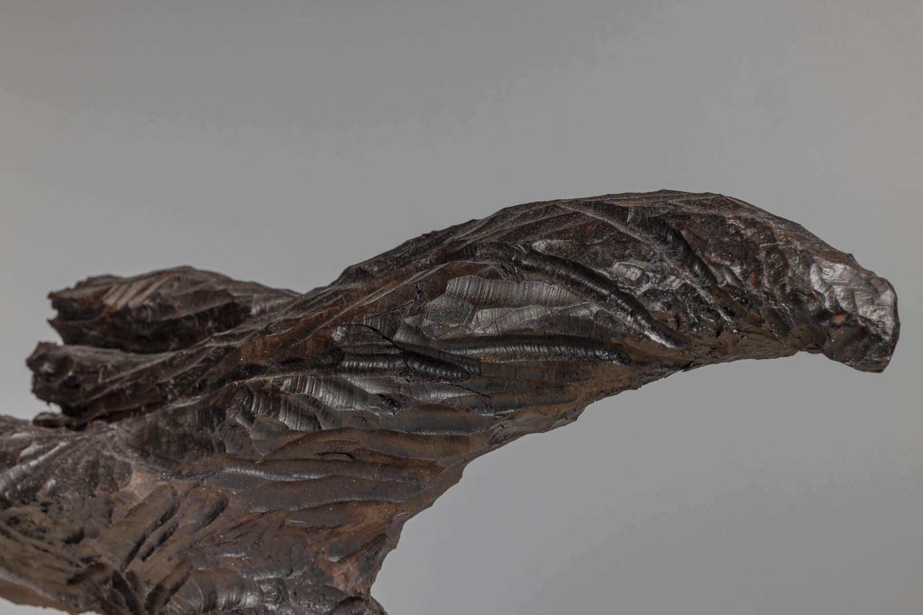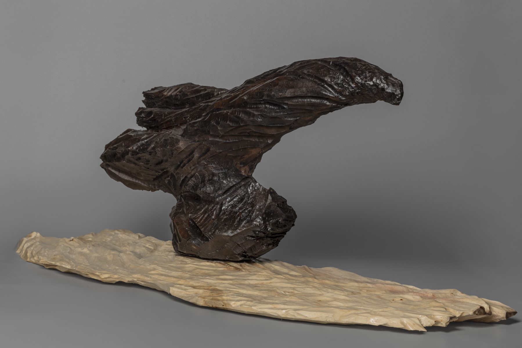 Escultura en madera de Nogal y Abedul. Representa ese vuelo ágil del cuervo que nos sobrevuela señalándonos el camino de la libertad, del cambio por venir.